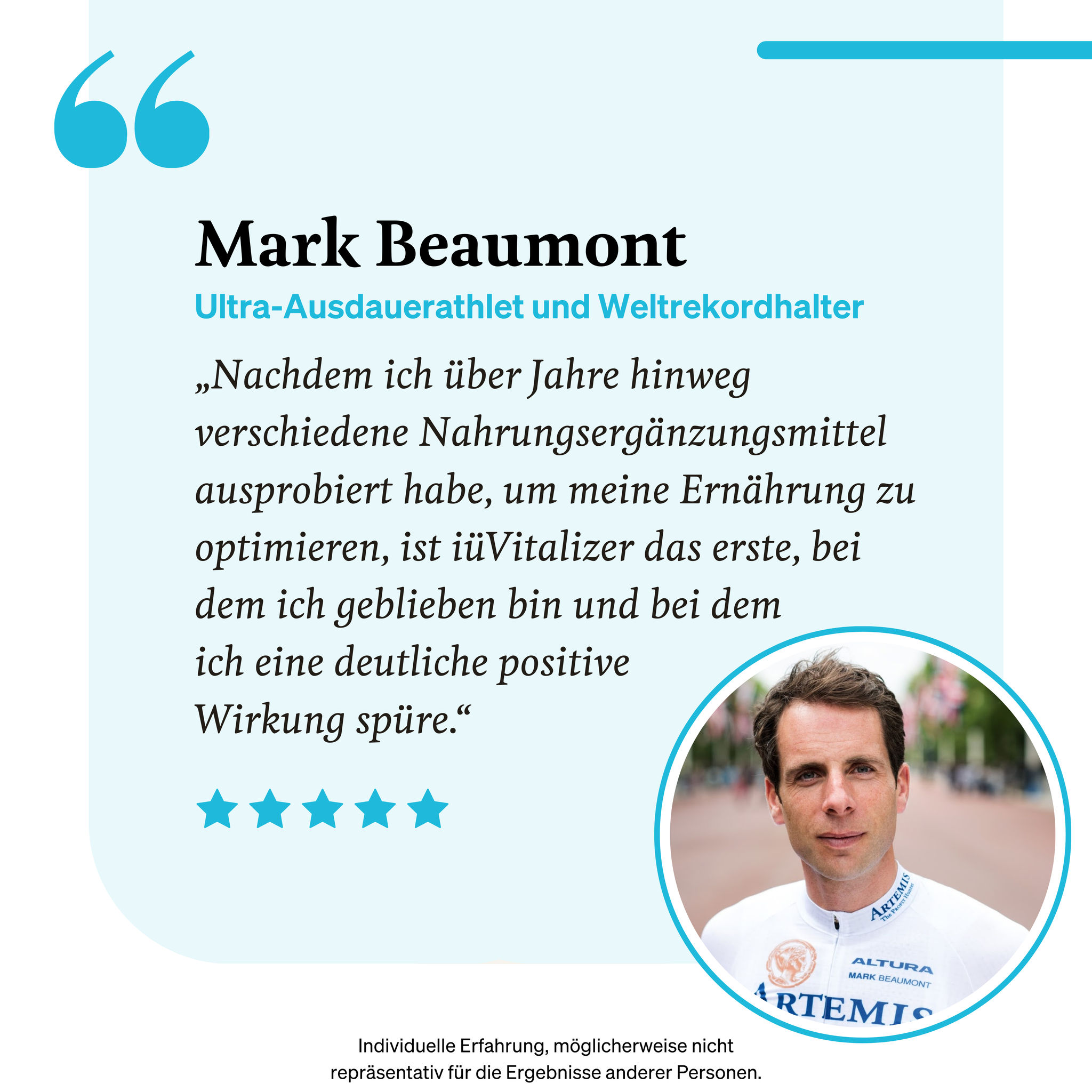Um auch nach seinen Rekorden leistungsfähig, belastbar und gesund zu bleiben, vertraut Mark seit über zwei Jahren auf den iüVitalizer.
