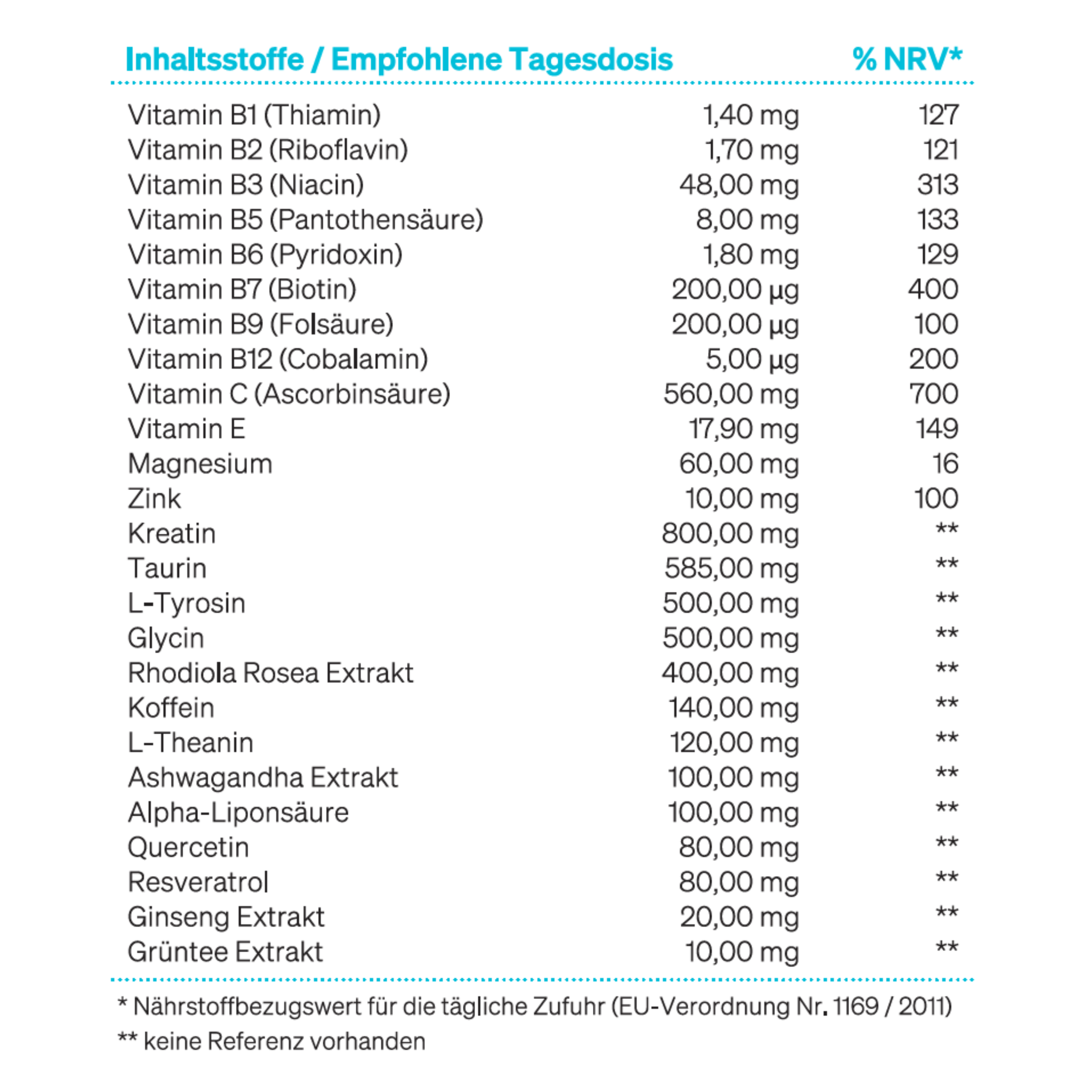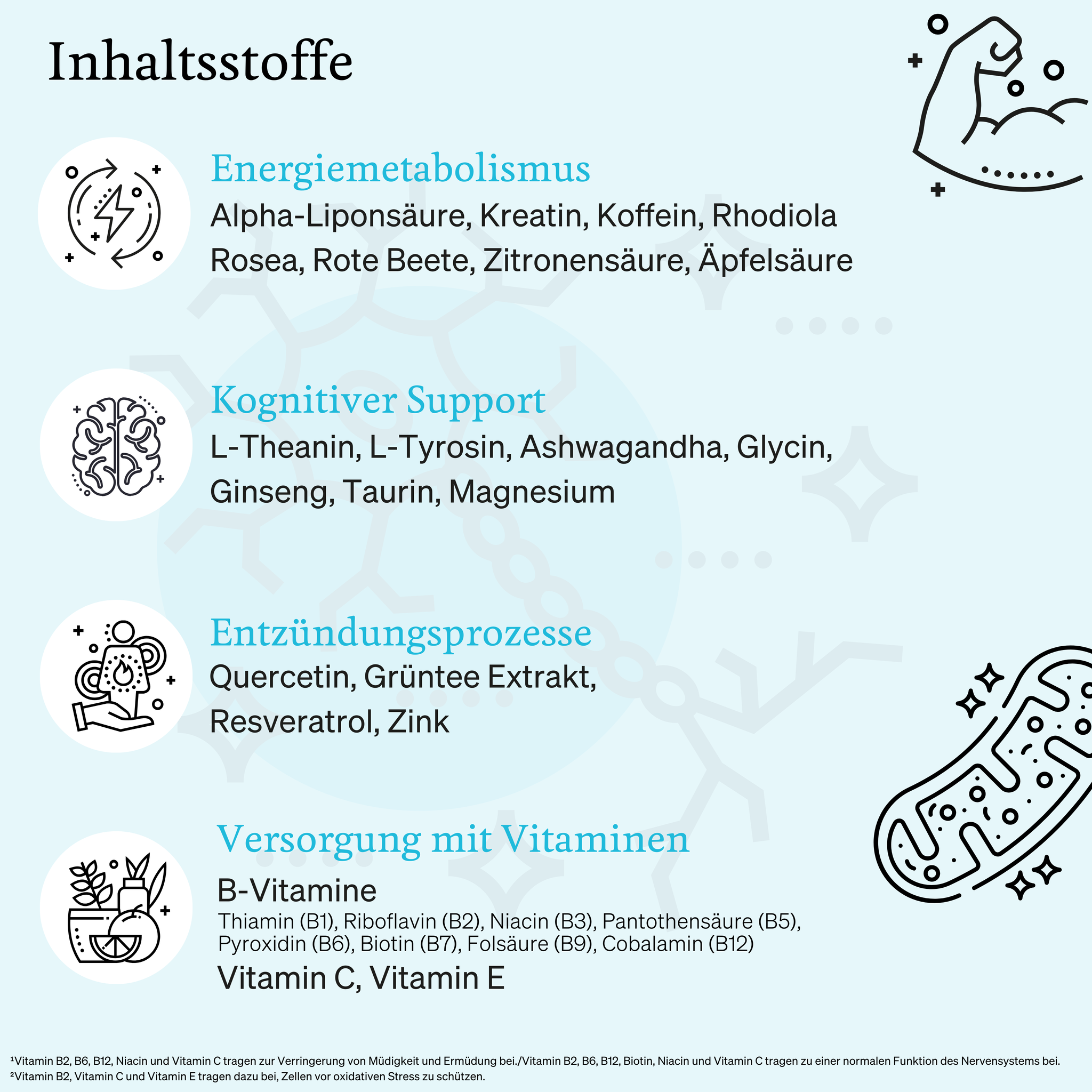 Die Kombination aus über 30 sorgfältig ausgewählten bioaktiven Inhaltsstoffen sorgt für spürbare Wirkung ab der ersten Einnahme, unterstützt Deine körperliche und geistige Leistungsfähigkeit¹ und liefert langanhaltende Energie – den ganzen Tag über¹. Zudem stärkt sie die natürliche Abwehr Deiner Zellen gegen oxidativen Stress².